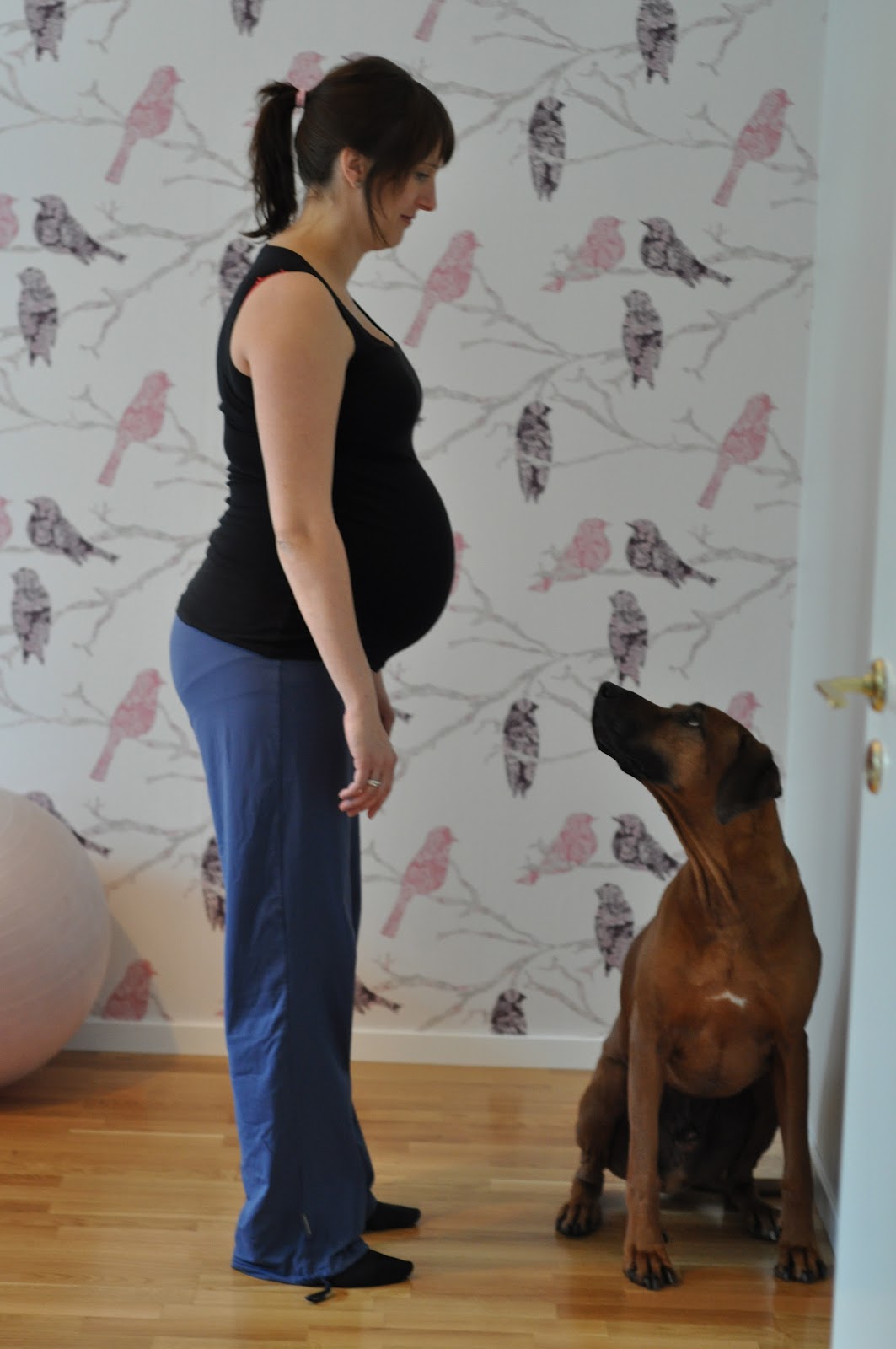Bilden ovan är exempel på en dålig hållning. Kvinnan på bilden är i slutet av graviditeten, v 35. Graviditeten påverkar rygg och bäcken rent mekaniskt då livmodern blir allt större och ändrar förhållandena i ländrygg och bäcken, vilket påverkar hållningen. Kvinnan får en ökad svank i ländryggen och blir mera ”rundad” i övre delen av ryggen. När övre delen av ryggen blir mera rundad så skjuts huvudet fram och nackens kurvatur ökar. Hormonen progesteron, relaxin och östrogen påverkar ligament och bindväv kring bäcken och ländrygg, vilket förändrar rörligheten i bäckenet och underlättar förlossningen. Det blir en ökad belastning kring ländrygg och bäcken och det är därför viktigt att tänka på hållningen och att träna hållningsmusklerna.