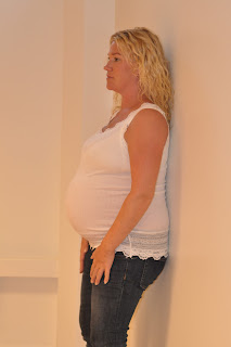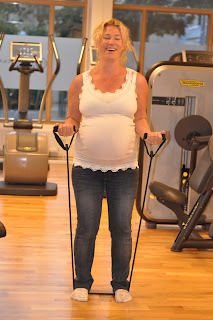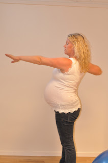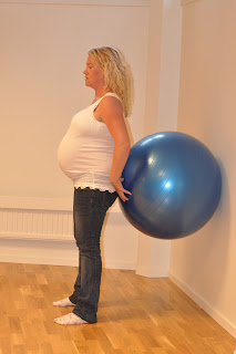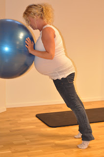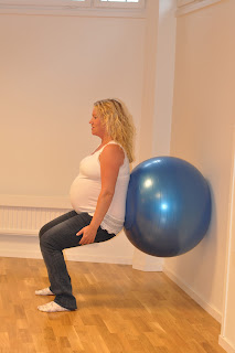 5/ Armhävning stående på tå. Kan göras med eller utan boll. Tänk att svankotan ska röra sig mot blygdbenet och att du lyfter musklerna däremellan upp mot magen. Placerar händerna brett framför dig på bollen. Jobba ner till böjda armar och upp igen med raka armar. Du kan även dra isar skulderbladen när du har armarna raka.