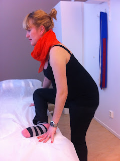 6/ Vridning för övre delan av ryggen. Du låser ländryggen (nedre delen av ryggen) genom att dra upp benen till 90 grader i höften. För den övre armen bakåt och känn att det drar mellan skulderbladen. Jobba sedan med den övre armen framför dig i riktning mot väggen, som om ngn skuller dra i din arm.