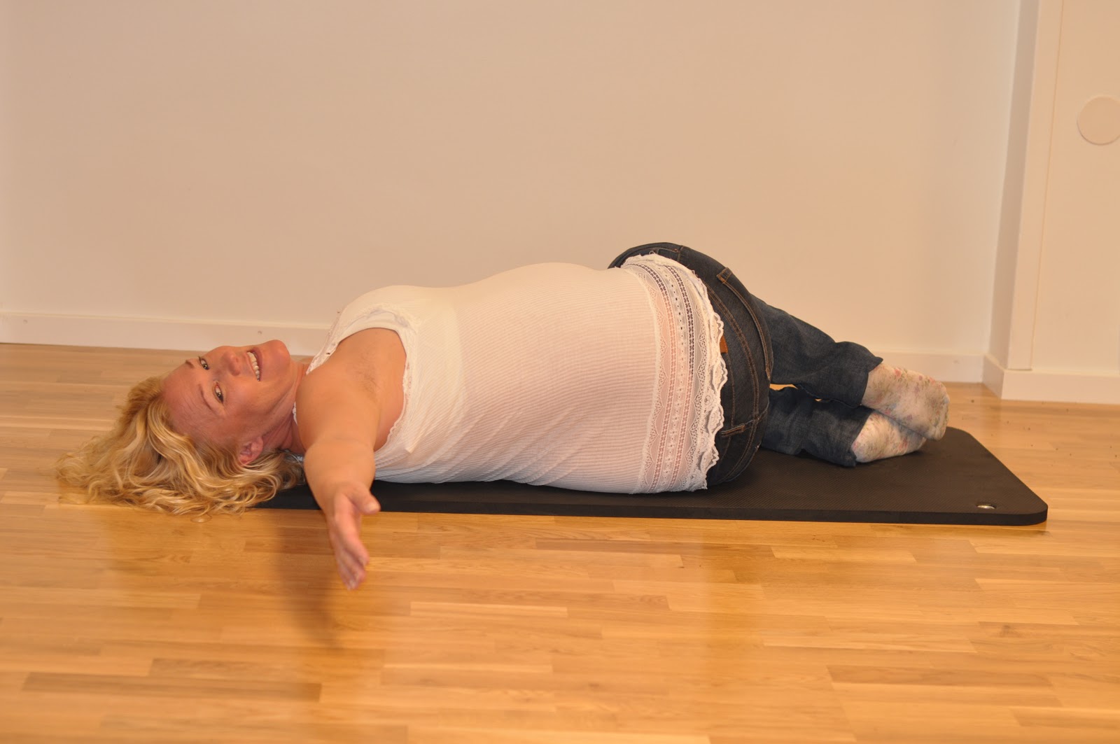 6/ Vridning för övre delan av ryggen. Du låser ländryggen (nedre delen av ryggen) genom att dra upp benen till 90 grader i höften. För den övre armen bakåt och känn att det drar mellan skulderbladen. Jobba sedan med den övre armen framför dig i riktning mot väggen, som om ngn skuller dra i din arm.