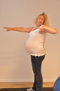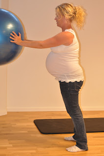 5/ Armhävning stående på tå. Kan göras med eller utan boll. Tänk att svankotan ska röra sig mot blygdbenet och att du lyfter musklerna däremellan upp mot magen. Placerar händerna brett framför dig på bollen. Jobba ner till böjda armar och upp igen med raka armar. Du kan även dra isar skulderbladen när du har armarna raka.
