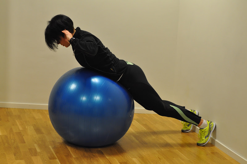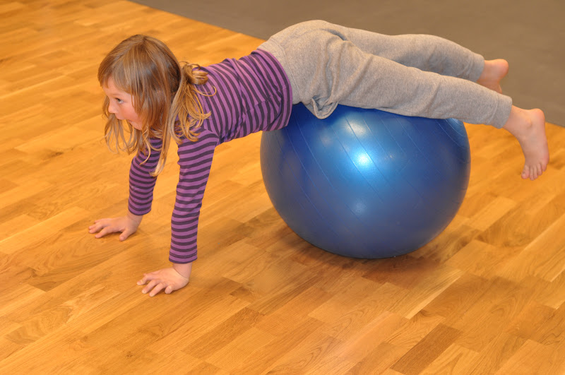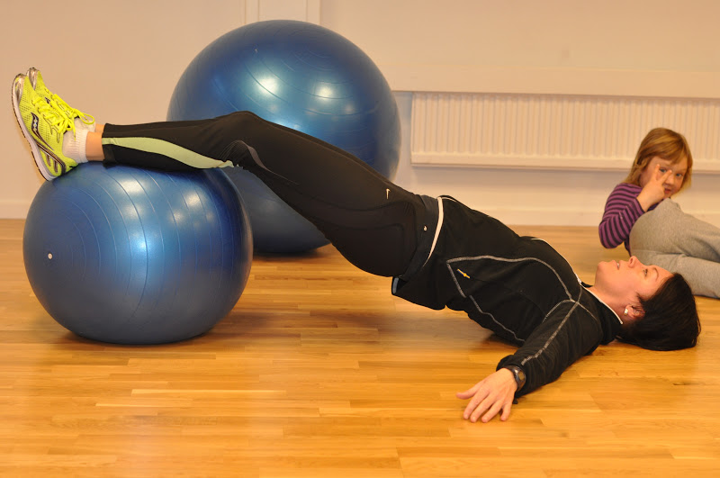 7a/ Sit-ups på boll. Ligg på rygg på bollen. Känn att du ligger stadigt. Lyft bäckenbotten och dra in naveln lätt in mot magen. Denna övning bör inte göras när magen blivit större, utan främst när magen är mindre, samt efter graviditet.